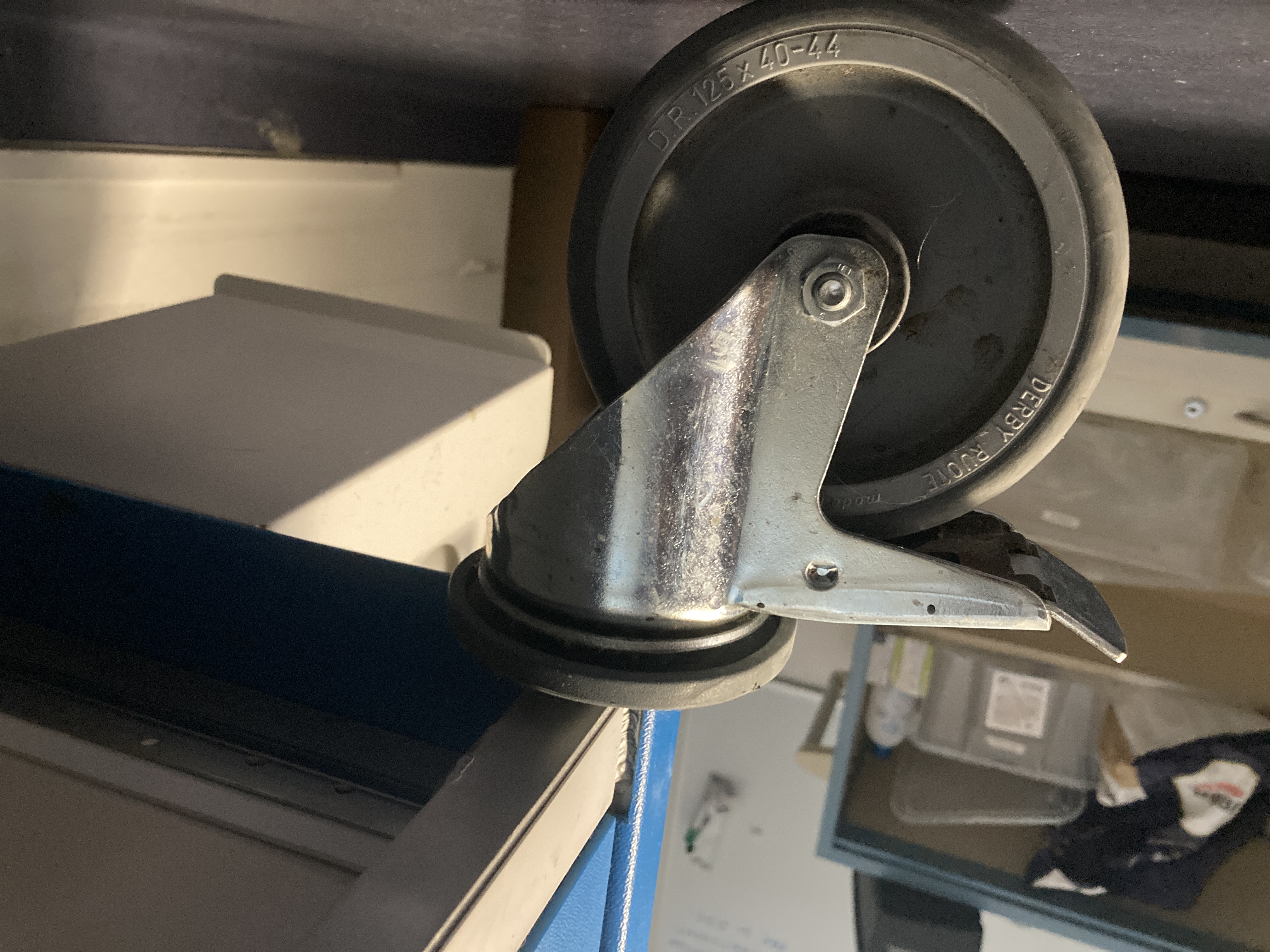 Embase de chariot composée de deux roues centrales fixes qui supportent la charge, et quatre roues pivotantes